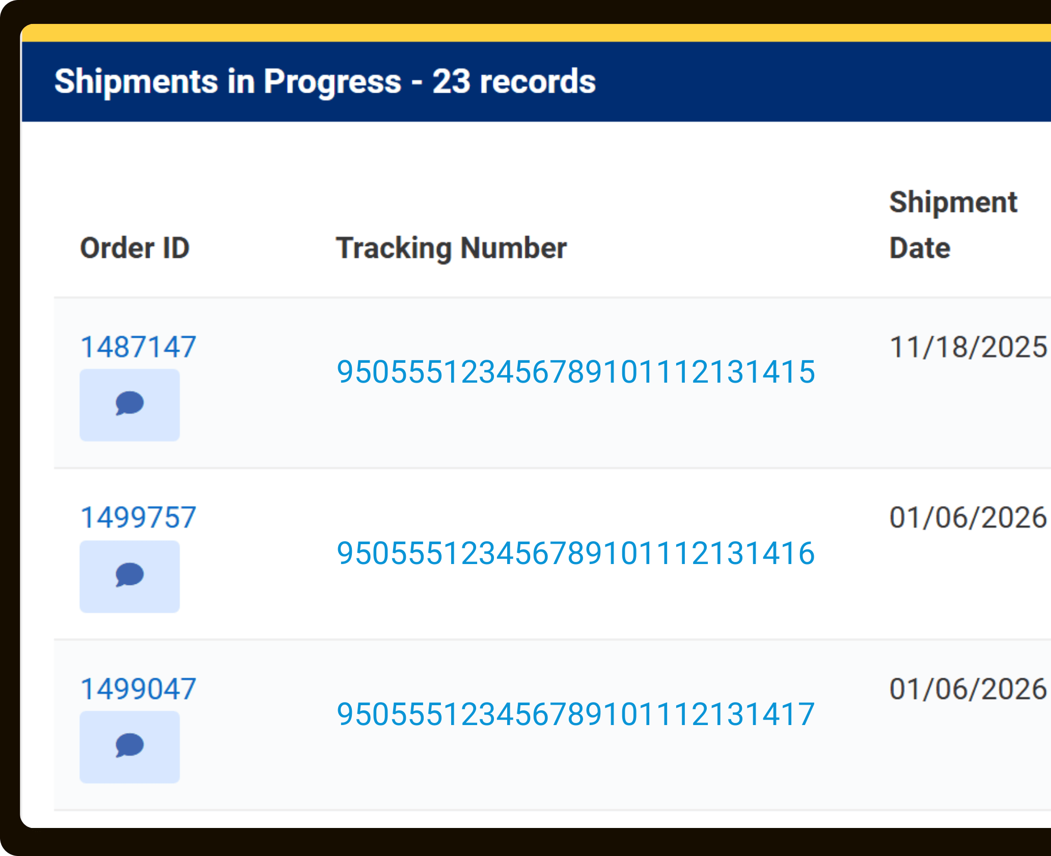 Add tracking numbers and carrier info directly to orders for real time updates on transport and delivery. See each piece of technology as it moves from the warehouse to the student’s home.