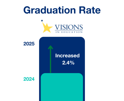 This year’s results show meaningful gains across core areas. In English Language Arts, Visions students increased 6.4 points toward the learning standard, outperforming the state average by 1.3 points. Visions students outperformed the state in Mathematics as well, increasing 20.6 points toward the learning standard. Students learning English made a 2.7% increase in language development. We are also proud to celebrate our second highest graduation rate in Visions history, at 84.2%.